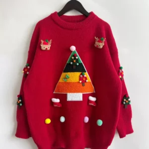 Red Christmas Sweater for Women with Elk Flocking & Pearl Ball Details