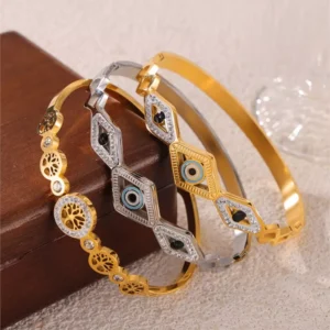Gold-Plated Devil’s Eye Stainless Steel Bangle with Zircon Inlay for Women