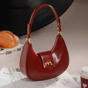 Vintage Red Crescent Underarm Bag – Genuine Leather Shoulder Bag for Women