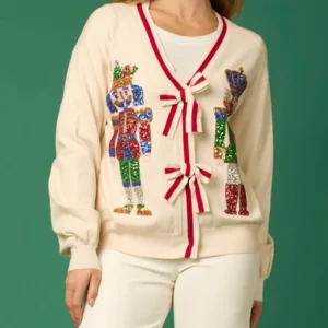 Women’s Sequin Nutcracker Christmas Cardigan Sweater – Glitter V-Neck Bow Knitwear