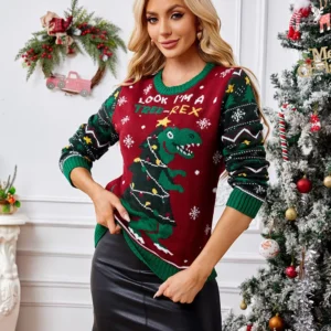 Women’s Ugly Christmas Sweater with Dinosaur Design