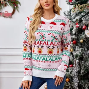Women’s Vintage Christmas Knit Sweater, Red O-Neck Pullover, Loose Fit