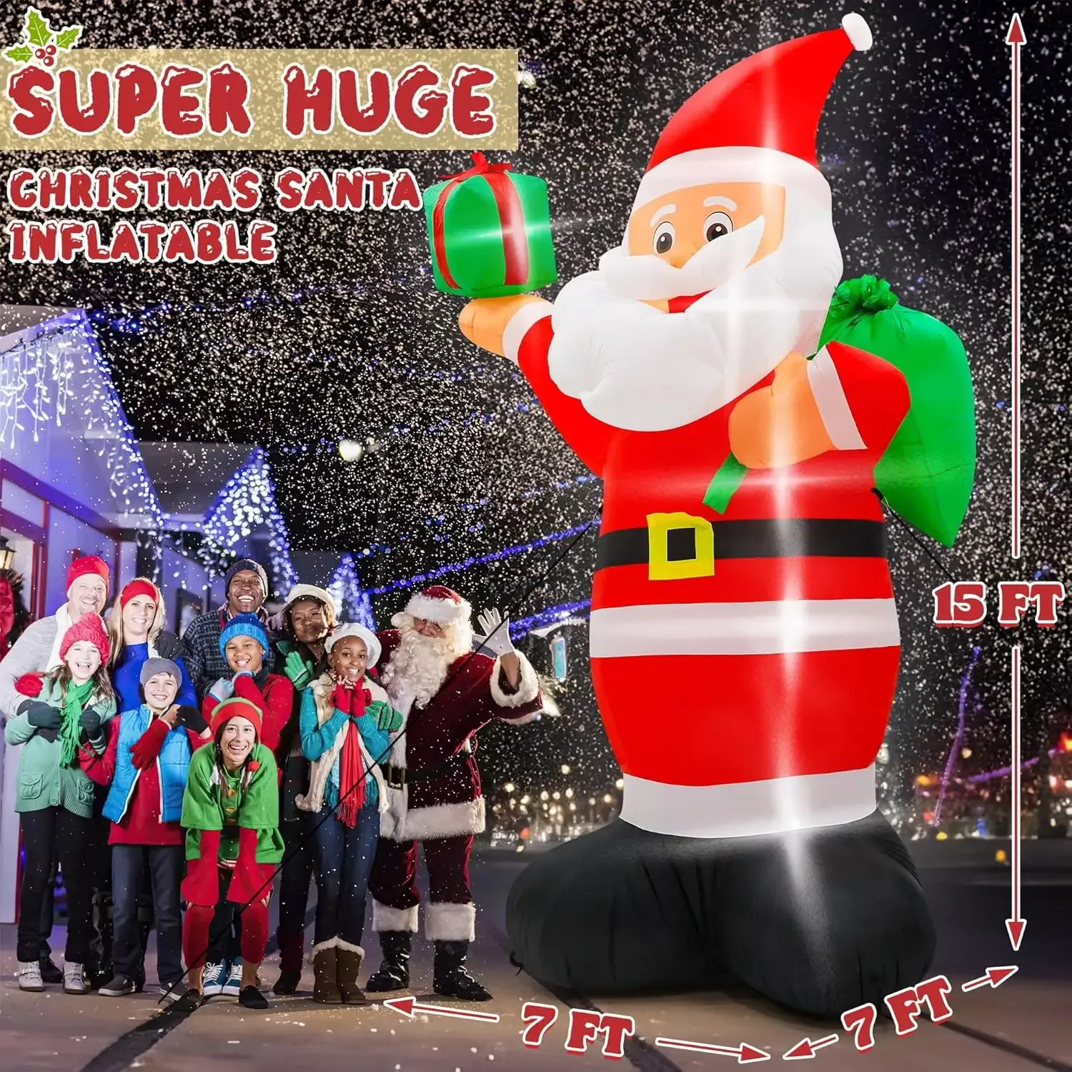Transform your yard into a winter wonderland with this impressive 15-foot tall inflatable Santa Claus, holding a sack brimming with presents and welcoming everyone with a cheerful wave. This giant inflatable Santa, with his radiant presence and six built-in LED lights, brings an unforgettable sparkle to your Christmas display, making it a show-stopping centerpiece that captures the spirit of the season. Perfect for adding charm to any outdoor space, this towering Santa is sure to become a local favorite and elevate your holiday decor to new heights!