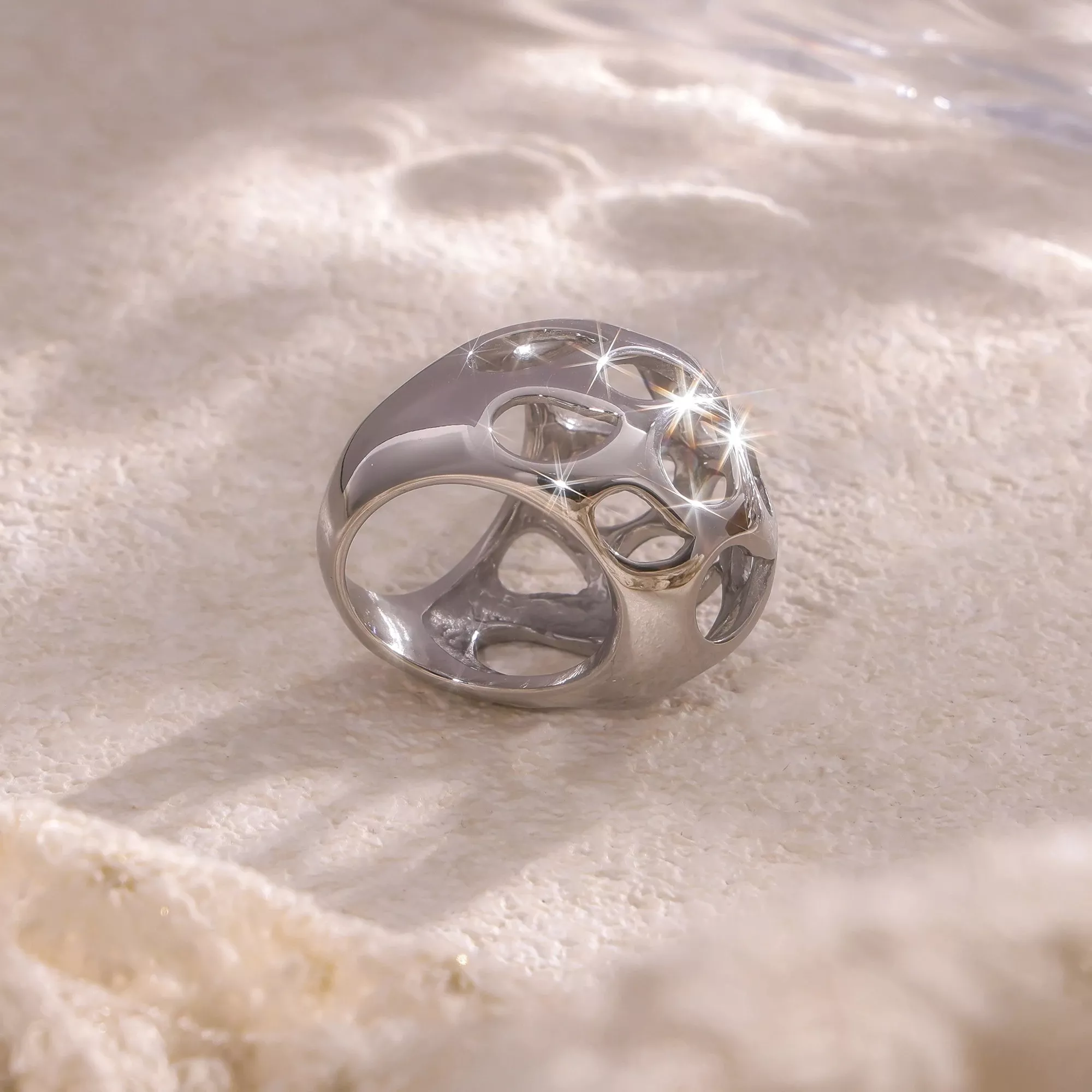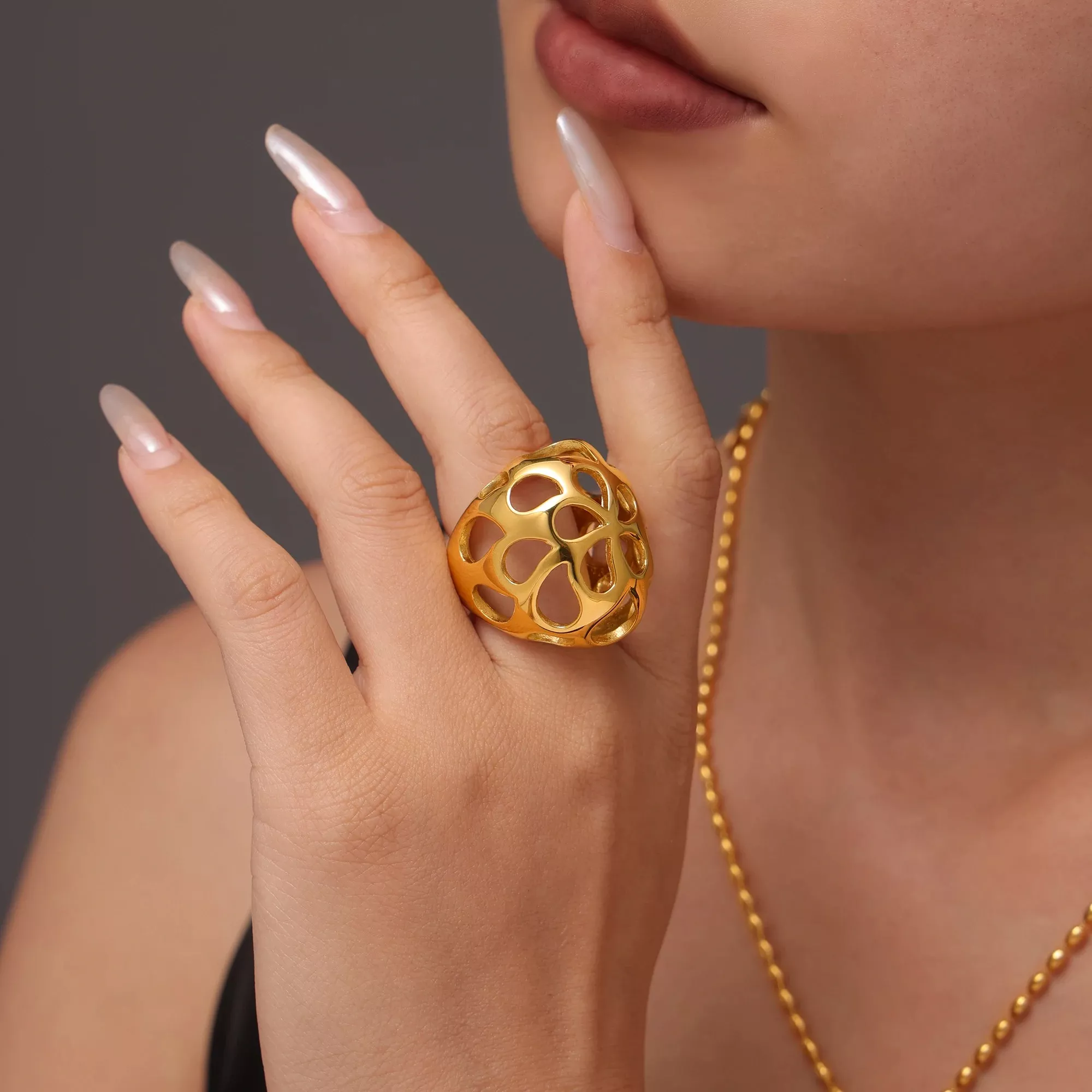 Stand out from the crowd with this stunning hollowed 316L stainless steel ring. Designed with a modern twist and an aesthetic appeal, this ring is perfect for the confident woman who loves to make a statement. The 18k gold plating gives it a luxurious shine, while the durable stainless steel ensures long-lasting beauty. This ring is waterproof, tarnish-resistant, and perfect for any occasion, from chic parties to everyday wear.