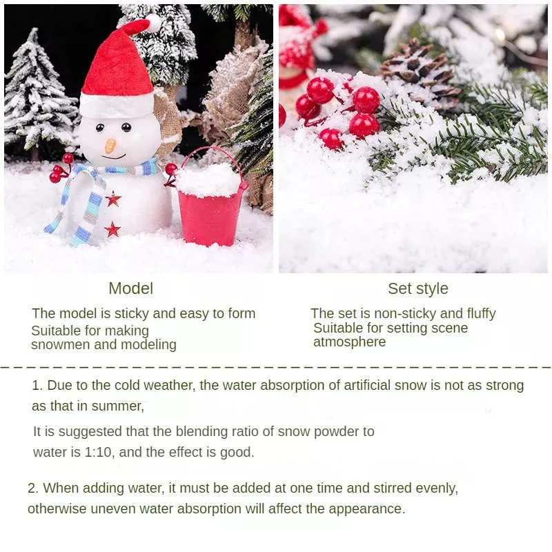• Safe & Non-Toxic: Perfect for homes, schools, and event spaces, this artificial snow powder is designed for safe, fun decorating.