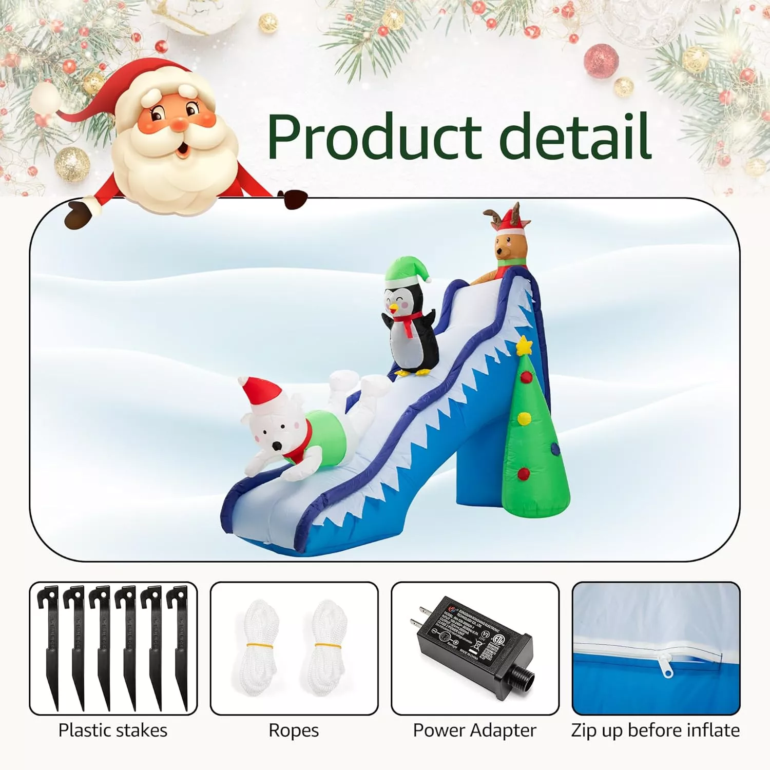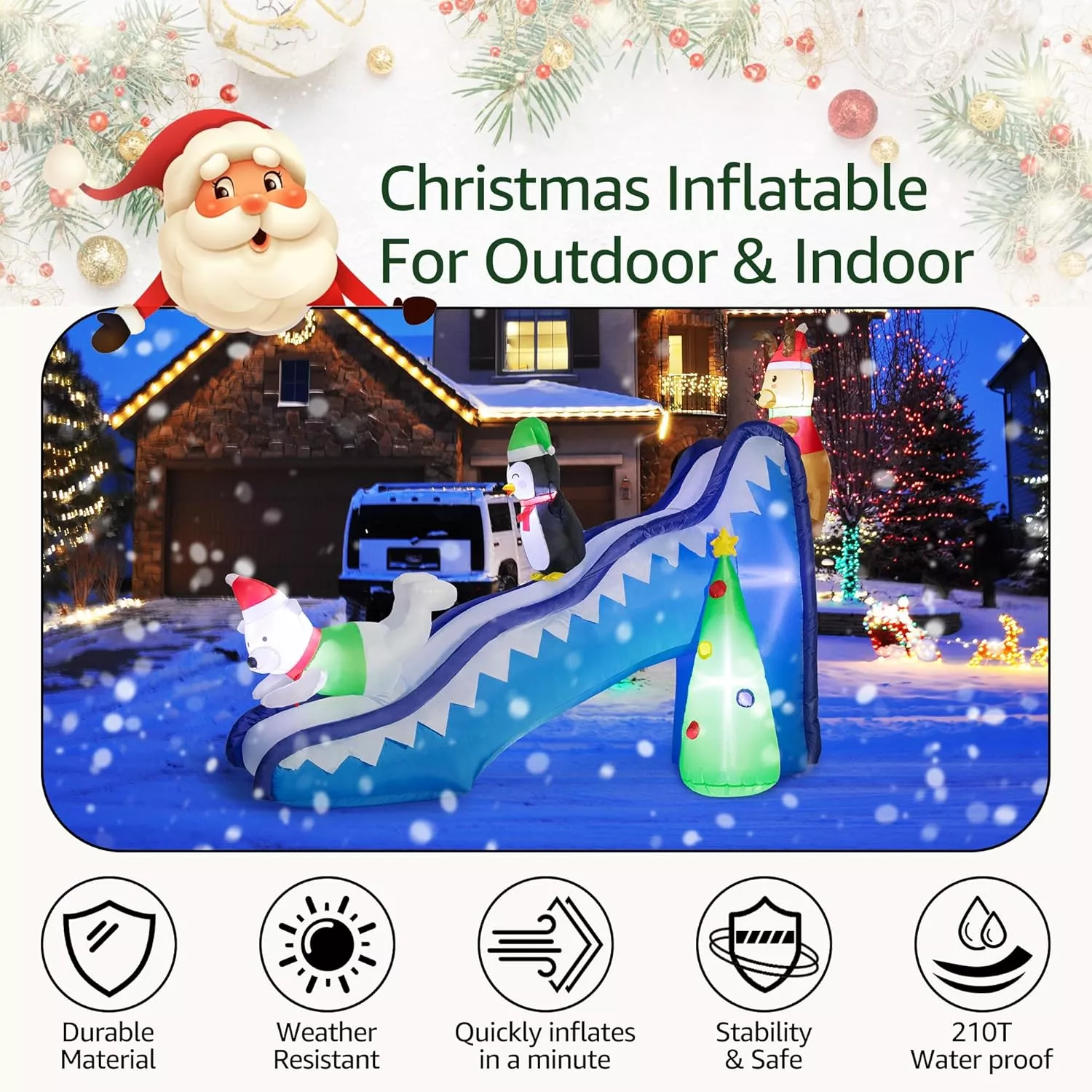 Transform your outdoor space into a delightful winter wonderland with this impressive 9 FT Christmas inflatable slide scene. Featuring a charming cast of holiday friends—a playful penguin, cheerful reindeer, and a cuddly polar bear—this inflatable decoration is designed to enchant kids and adults alike. With built-in LED lights, this scene shines brightly through the night, creating a joyful ambiance that embodies the holiday spirit.