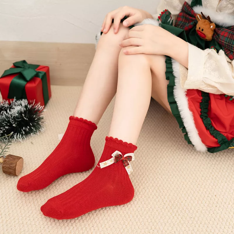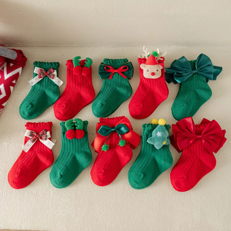 Celebrate the holiday season in style with these charming Children’s Christmas Socks. Designed for little girls, these festive socks combine comfort and cuteness with their delightful red and green color scheme and adorable cartoon designs. Featuring a sweet bow detail and playful holiday patterns like Santa and Christmas trees, they are the perfect addition to any festive outfit. Whether for a holiday party, a family gathering, or cozy moments at home, these socks will keep your child feeling warm and looking cute.