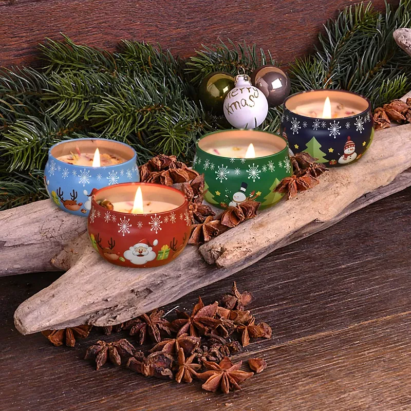 • Festive Designs: Each candle is enclosed in a decorative metal tin featuring adorable Santa Claus and snowman illustrations, making them ideal for holiday décor.