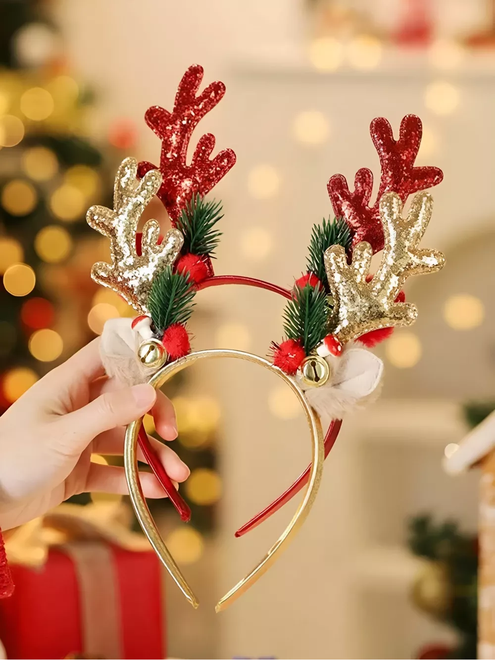 • Eye-Catching Design: Decorated with shimmering red and gold sequins, the headband features adorable elk horns and festive bells that jingle with every movement.