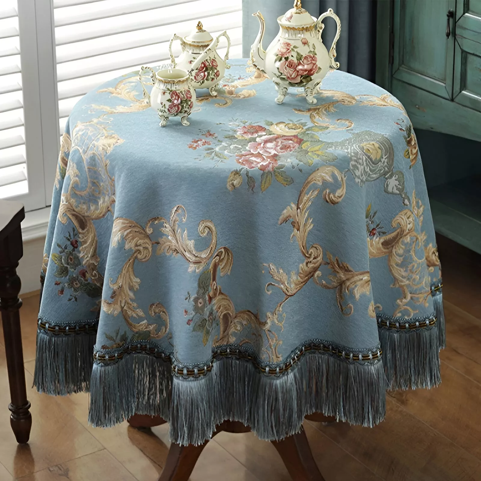 The European Tassel Embroidered Round Tablecloth stands out for its combination of aesthetic appeal and practical features. The woven chenille fabric adds a rich texture, while the dustproof and oilproof finish ensures easy cleaning and maintenance. Its floral embroidery and tassel detailing make it a unique centerpiece that draws attention and enhances your decor.