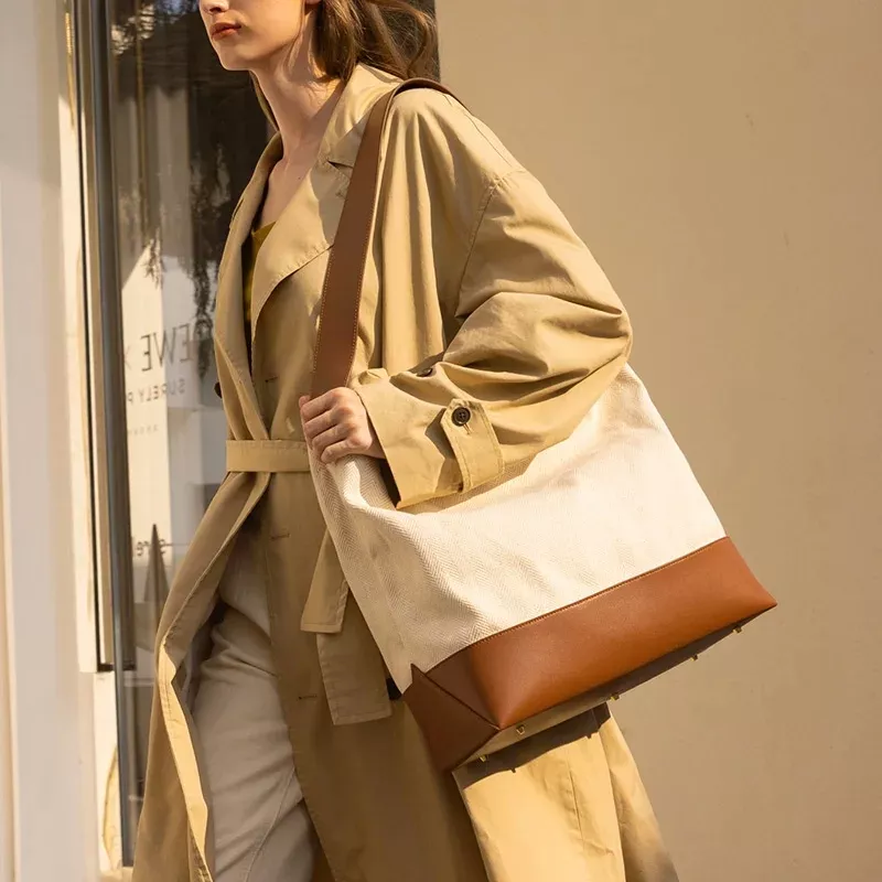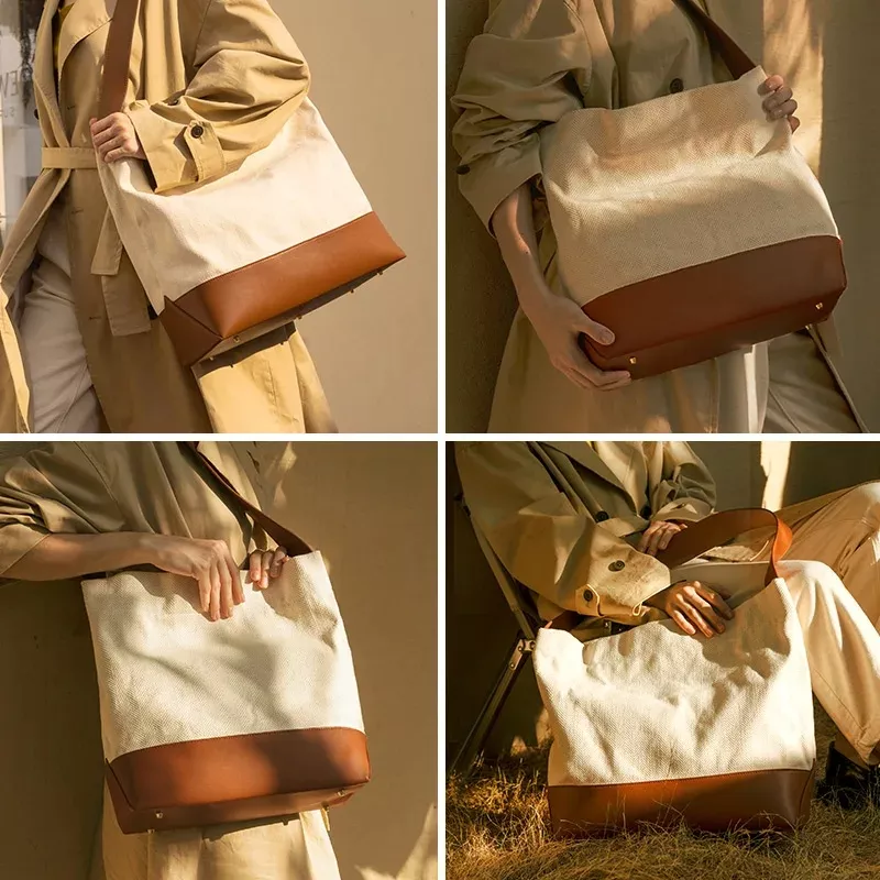 This bag is more than just an accessory; it’s a practical yet stylish companion for all your daily activities. Its mixed material design offers a sophisticated contrast, while the large capacity ensures you can carry everything you need—from laptops and books to makeup and snacks. With a casual yet refined look, it’s perfect for women who value both fashion and functionality.