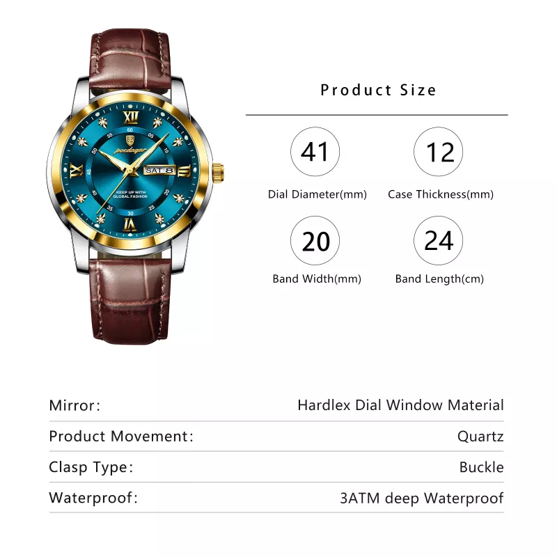 Ready to add a sophisticated touch to your wrist? This luxury men’s watch is the perfect combination of elegance, practicality, and durability. With its stylish leather strap, accurate quartz movement, and versatile features, it’s a watch that fits seamlessly into any lifestyle. Don’t settle for ordinary – choose a watch that’s as functional as it is fashionable. Get yours today and elevate your style with every tick of the clock!