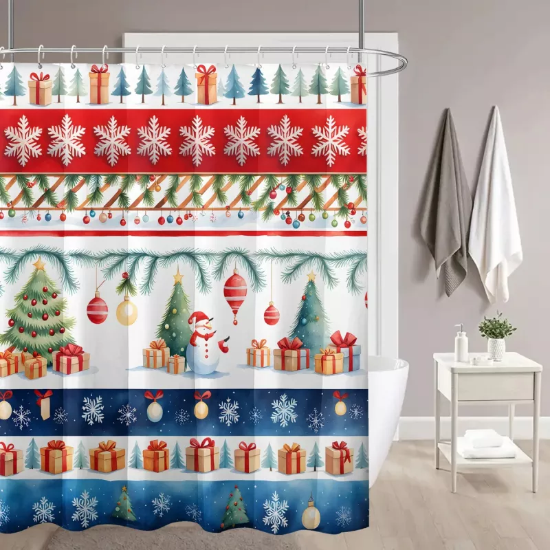 This shower curtain measures a generous 71 x 71 inches (180 x 180 cm), providing excellent coverage for your shower or bath area. The vibrant red and green colors, combined with whimsical snowflake designs, create a warm and inviting atmosphere, perfect for the holiday season. It comes equipped with 12 plastic hooks, making installation quick and hassle-free.
