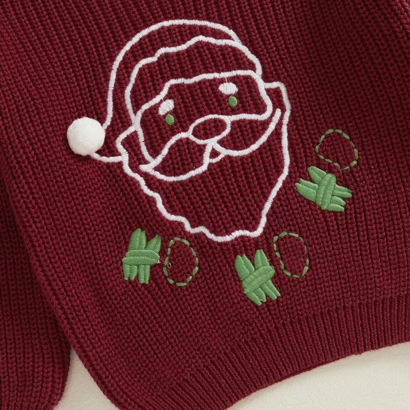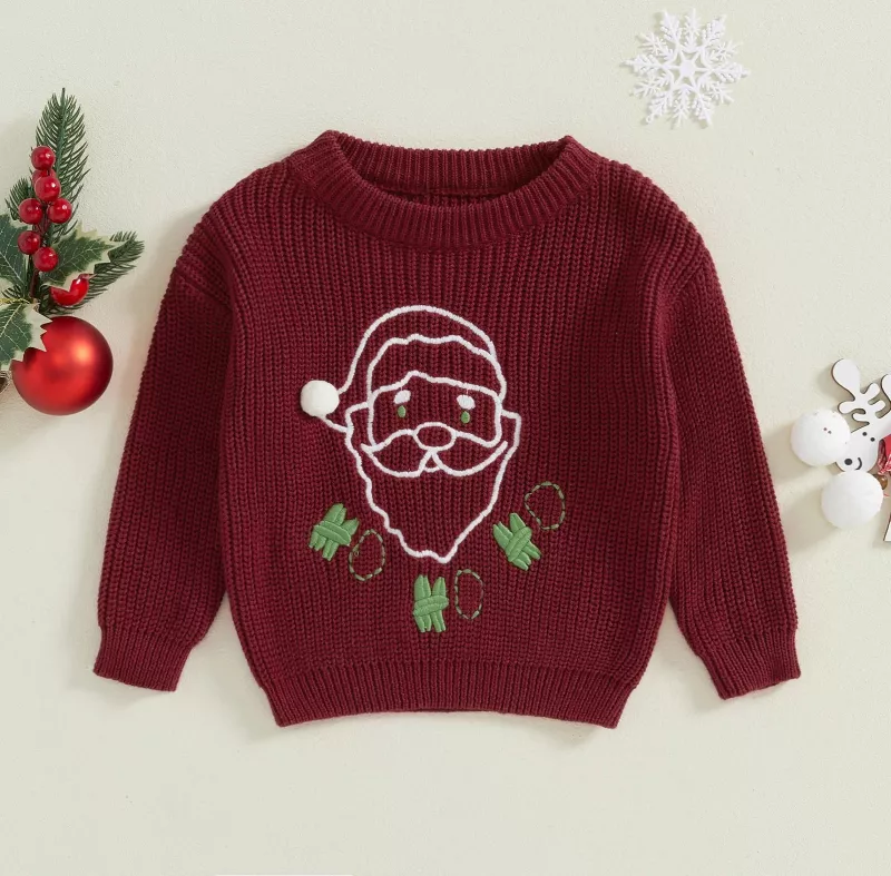 Featuring a charming Santa embroidery on the front, this sweater brings a cheerful touch to your child’s winter wardrobe. The long sleeves and ribbed knit design provide a snug fit, while the round neck ensures easy wear. Whether it’s for a holiday celebration or everyday wear during the winter, this sweater adds a festive flair that will make your child the center of attention.