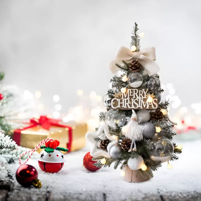 Celebrate the season with our charming Small Artificial Christmas Tree. Perfectly sized at 12 x 12 x 18 inches, this tree is designed to fit beautifully on any tabletop or desktop, creating a cozy and festive atmosphere wherever it’s placed. Adorned with elegant silver and white ornaments, pine cones, and a large bow topper, it’s the ideal addition to your holiday décor. Its warm, soft lights add a magical touch that will bring joy and cheer to your space throughout the Christmas season.